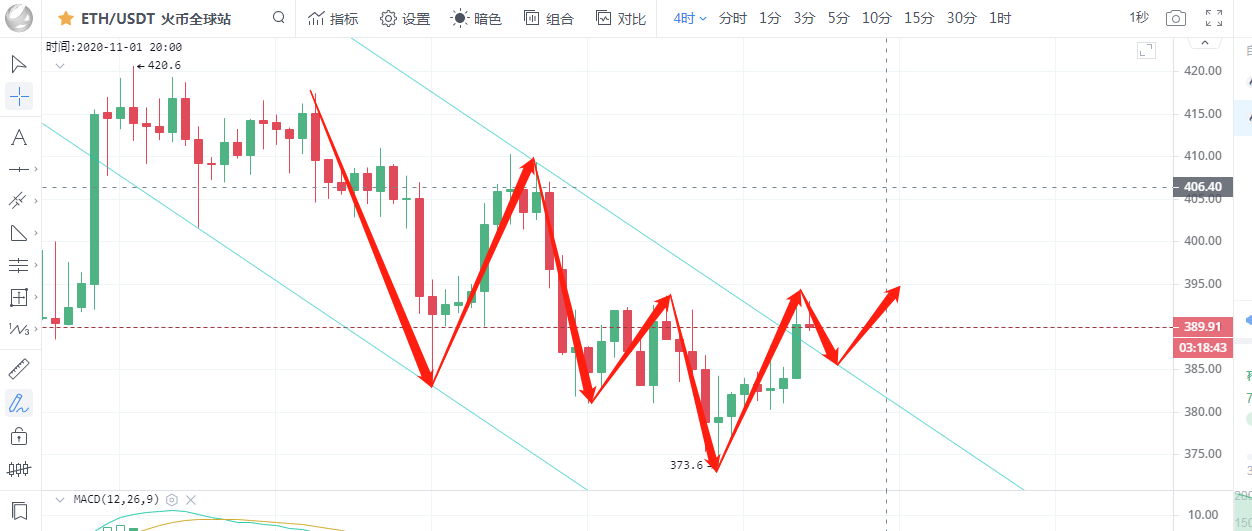 以太坊行情分析:从四小时图看,布林带缩口运行,下午以太坊受比特币影响一波上涨拉升突破布林带中轨,目前以太坊承压布林带上轨压制承压下行风险,5日均线上穿10日均线在下方形成支撑。附图中MACD双线金叉运行在零轴下方,绿色动能柱持续放量,KDJ三线金叉向上发散。四小时以太坊晚间关注上方395一线压制,从小时线看,k线呈现震荡上行的局面,5日均勾头向上,多头趋势较为浓重。上方压力位395,下方支撑位385.