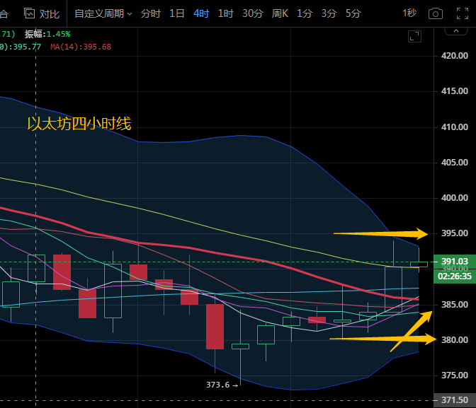 以太坊今日走势先跌后涨,日内回踩并没有跌破下方380的强力支撑,刚刚的一波拉升,上行触及最高点394后回踩,目前稳定在391附近。以太坊四小时级别来看,布林带向下缩口运行,行情在中下轨区域运行不断向上试探。MA5上穿MA10金叉运行。附图中MA快慢线金叉向上运行在零轴下方,绿色动能柱开始放量KDJ三线向上发散运行。晚间操作建议关注下方380支撑,上方阻力看395-400,操作建议低多为主,高空为辅关注公众号:币汐柔。