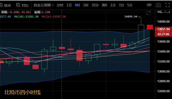 比特币今日行情还是走震荡上行,刚刚的行情拉升刷新新高站上14000上方至14099.94后回落,暂时稳定在13900附近。比特币四小时级别来看,布林带平缓向前运行,币价上行刺破上轨后再次回踩,暂时稳定在上轨上方区域运行,各均线勾头向上运行在零轴上方。附图中MACD快慢线拐头向上运行在零轴上方,KDJ三线向上发散。晚间操作建议关注下方支持13350,上方阻力看到14000,破位看14100,操作建议低多为主,高空为辅关注公众号:币汐柔。