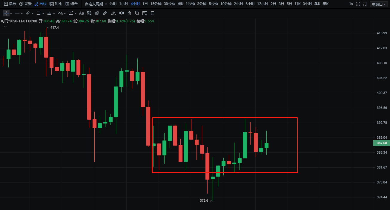 以太坊四小时级别来看价格整体保持区间震荡,从趋势来看目前趋势还未转换,布林带呈缩口向下运行,价格于布林带中轨附近运行。各均线缠绕运行,继续关注区间破位情况。幅图指标MACD于0轴下方金叉运行,KDJ指标三线粘合运行,RSI指标三线拐头向上运行。上方压力位395,下方支撑位380。操作上高空低多为主。