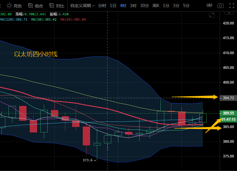 以太坊昨日走势先跌后涨,昨日回踩并没有跌破下方380的强力支撑后反弹拉升上行触及最高点394后回踩,今日凌晨行情回调至低点384附近后小幅反弹。以太坊四小时级别来看,布林带缩口向前运行,行情在中上轨区域运行不断向上试探。MA5上穿MA10金叉向上运行。附图中MACD快慢线金叉向前运行在零轴下方,绿色动能柱开始放量,KDJ三线聚合向前运行。汐柔建议日内操作关注下方380支撑,上方阻力看395-400,操作建议低多为主,高空为辅。