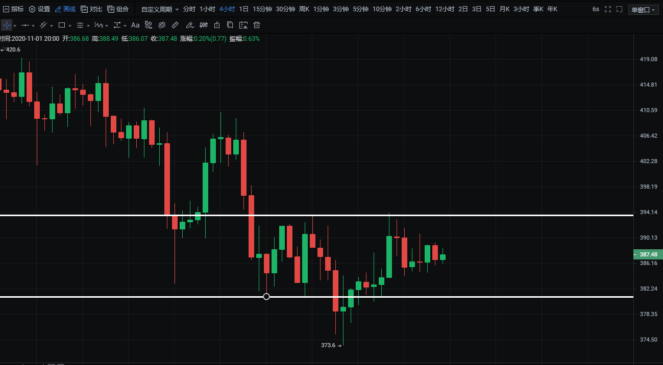 1:下破380做空,目标373-375,止损385