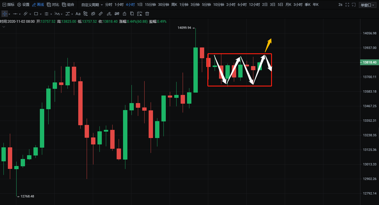 比特币四小时级别来看价格冲高14099美金受阻回落,目前行情持续高位区间震荡,日内关注行情破位情况。前期吸血式上涨,预计会有一个修复期。各均线依旧呈多头排列。幅图指标MACD快慢线双线粘合运行,KDJ指标三线有向上运行迹象,RSI指标三线有向上拐头迹象。上方压力位14000,支撑位13600。操作上高抛低吸为主。