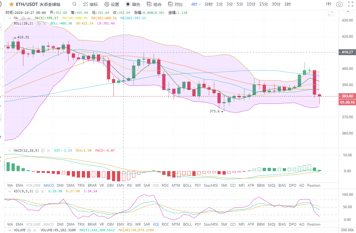 以太坊行情分析:以太坊早间突破400一线但并未企稳,随后联动比特币迎来一波瀑布性跳水,最低下跌至378开始反弹,目前重回380上方运行。从四小时图看,布林带张口运行,K线运行在布林带中轨下方,附图MACD双线粘合有形成死叉的迹象,绿色动能柱持续缩量,以太坊的空头气息较为浓重,操作上建议反弹做空。上方压力位390,下方支撑位375.