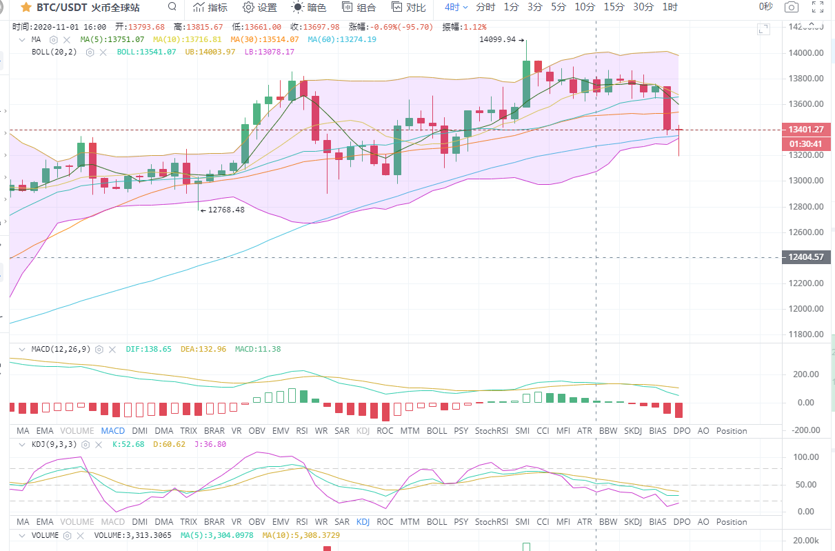 比特币行情分析:比特币在晚间跌破13600一线支撑,进行大幅跳水至13200一线获得支撑后开始有所反弹,但目前来看,反弹强度还可以,晚间关注是否先能回到13400一线上方。从四小时线看,布林带缩口运行,K线重回布林带中运行,5日均线下穿10日均线死叉向下运行,附图MACD双线死叉向下运行,红色动能柱强势加强。四小时图看,多头有反弹上行的需求,关注是否能够企稳13400一线,若企稳比特币将继续上探。上方压力位13600,下方支撑位13200.