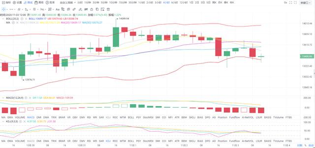 从四小时图来看,目前币价运行均线中下轨区域,布林带呈现开口状态,附图指标,MACD快慢线顺势下走,空头量柱仍在放量,KDJ三线连续交叉目前平行向下,今日MG大选关于技术层面参考价值不大,若是回调力度较强日内高位做空为主,当然要是跌破13200美元支撑位置,也不失为入场时机。