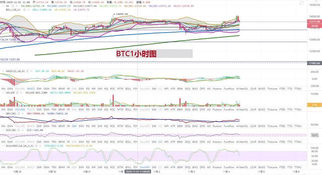 BTC行情分析:小时图中,早间比特币行情区间震荡之后,行情再度冲高,最高点触及14058一线,随后行情回落收取的阴线直接吞没之前冲高的阳线。布林带经过冲高后整体偏上移,下方短期支撑在13620一线,上方压力在新高,也可结合以太坊上方短期压力位具体分析。