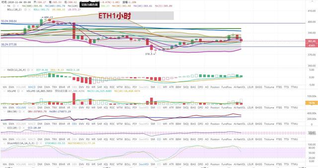 ETH行情分析:联动于比特币,今日冲高高点触及390关口,随后行情回落,短期下方支撑位380关口,布林带偏上运行,下方MACD中多头量能持续释放。整体上,是个多空反复的行情,需要注意风控和合理把握利run。