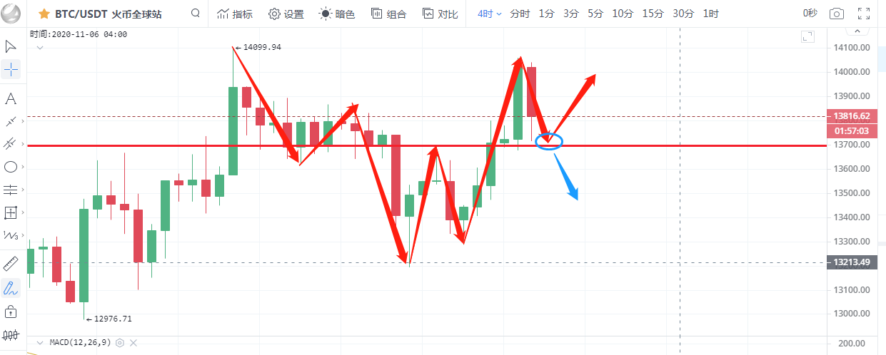 比特币行情分析:比特币早间一波拉升上涨再次回到14000一线,但后续多头量能不足,迅速回落,目前在13816一线附近。从四小时图看,上个周期一根大阳线拉起,直破布林带上轨,目前币价重回布林带中运行,5日均线上穿10日均线金叉向上,附图中MACD金叉在零轴上方运行,绿色动能柱持续放量。从指标上看,多头占优,但刚刚的那波回落同样不容小觑,说明上方抛压较为严重,若行情回落能企稳13800可以考虑多单入场,同样若回落过深直接跌破13700,那么将继续下探。