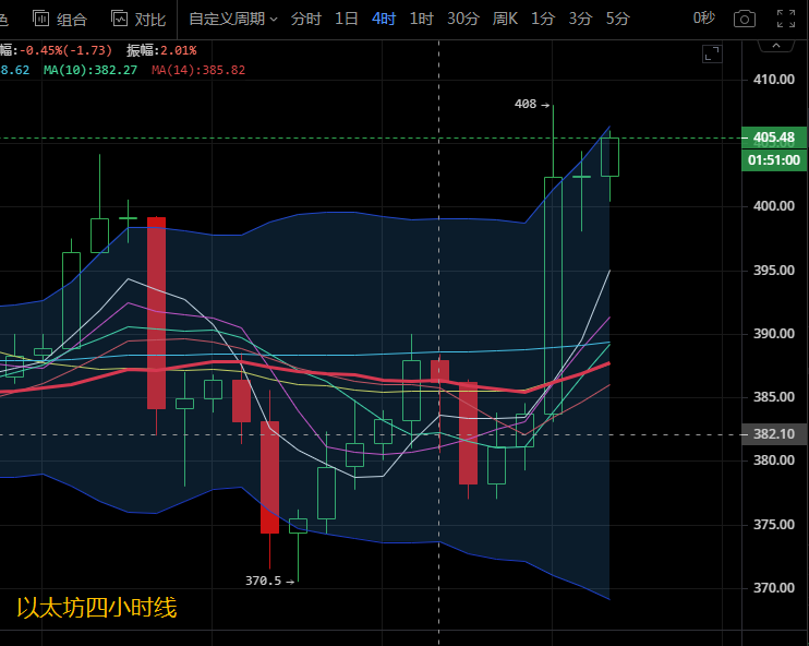 以太坊昨日行情相比比特币上行动能较弱,日内高点390,低点377。今日凌晨行情暴力拉升向上插针突破400关口至最高点408,目前稳定在403.6附近。以太坊四小时级别来看,布林带张口向前运行,行情向上插针突破上方上轨压制后再次回落其下方运行。各均线呈多头排列,日内预计有进一步上行可能,目前稳定在400上方震荡。附图中MACD快慢线向上运行在零轴附近,绿色动能柱放量,汐柔建议操作关注下方390支撑,上方阻力看410,破位看420.操作建议低多为主,高空为辅。