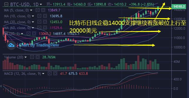 比特币日线上来看近期走势看涨不变,日线走势来看近期一个月连续震荡上行,K线已经三连阳,MA均线走势良好,意味着多头健康,之前是试探到了14000的位置后开始回落,今天我们需要关注的是能否有效企稳14000上方,多头的强势能否有效延续。日线上比特币最高触及高点14360后回落下行至14200一线盘整运行,日线上始终布林带中轨缩口上扬。附图MACD在零轴上方金叉运行,红色动能柱,指标弱势加强。
