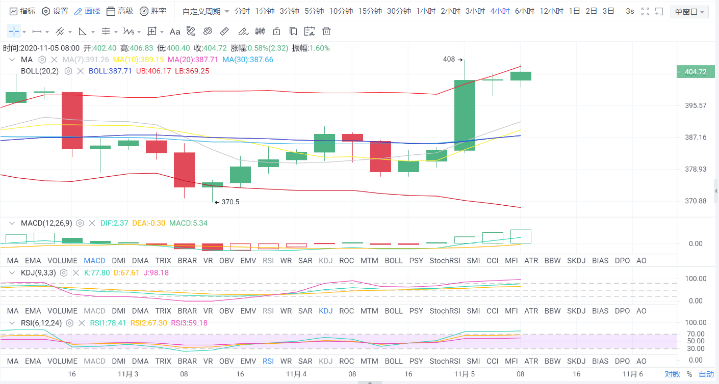 以太坊昨日行情相比比特币上行动能较弱,日内高点390,低点377。今日凌晨行情暴力拉升向上插针突破400关口至最高点408,目前稳定在403.6附近。以太坊四小时级别来看,布林带张口呈喇叭状,行情向上插针突破上方上轨压制后再次回落其下方运行。