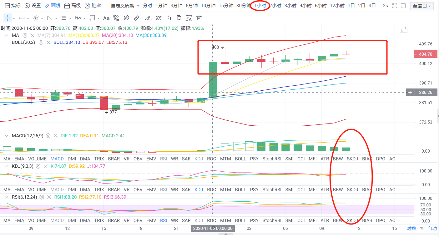 再看下小时图级别今日凌晨最高一波拉升至408点位,目前币价运行在均线上方,附图快慢线金叉高高上扬,多头力量持续放量,KDJ拐头向上意向交叉,RSI逐渐向下拐去,各均线呈多头排列,日内预计有进一步上行可能,目前稳定在400上方震荡。