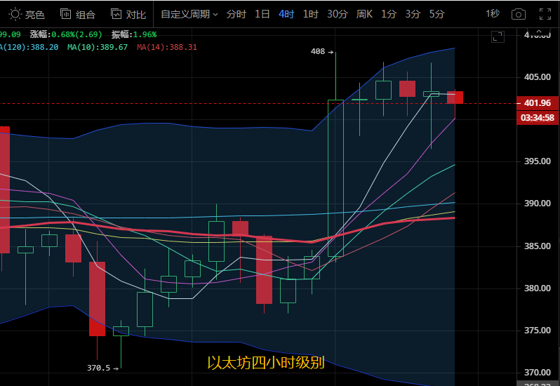 以太坊今日凌晨行情从383附近一根大阳线直接拉升至408高点,日内白盘行情震荡下行跌破400支撑后反弹至402附近运行。