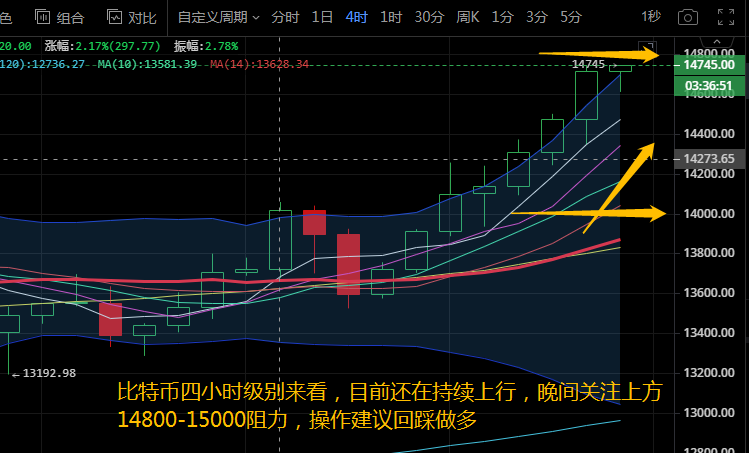 比特币小时线来看,布林带张口向上运行,行情一路高歌猛进冲破上轨压制至14666附近。各均线呈多头排列,附图中MACD快慢线金叉向上运行在零轴上方,绿色动能柱放量,KDJ三线向上发散运行。小时线界别,行情还处在拉升趋势当中,操作建议回踩做多。晚间关注上方阻力14800-15000,下方支撑看14000。