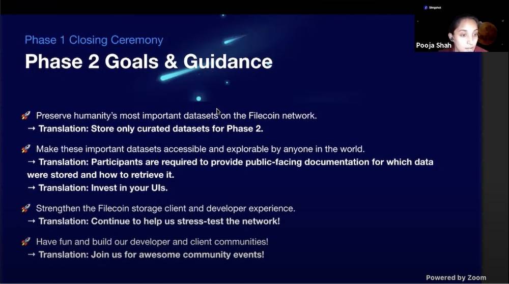 为启动闭幕式,Filecoin产品负责人Pooja Shah回顾了第一阶段竞赛四个星期中发生的情况。Filecoin网络本身经历了巨大的变化,包括成功的主网启动,五个社区主导的Filecoin改进提案,以及该网络继续扩展到超过675PiB的存储容量。