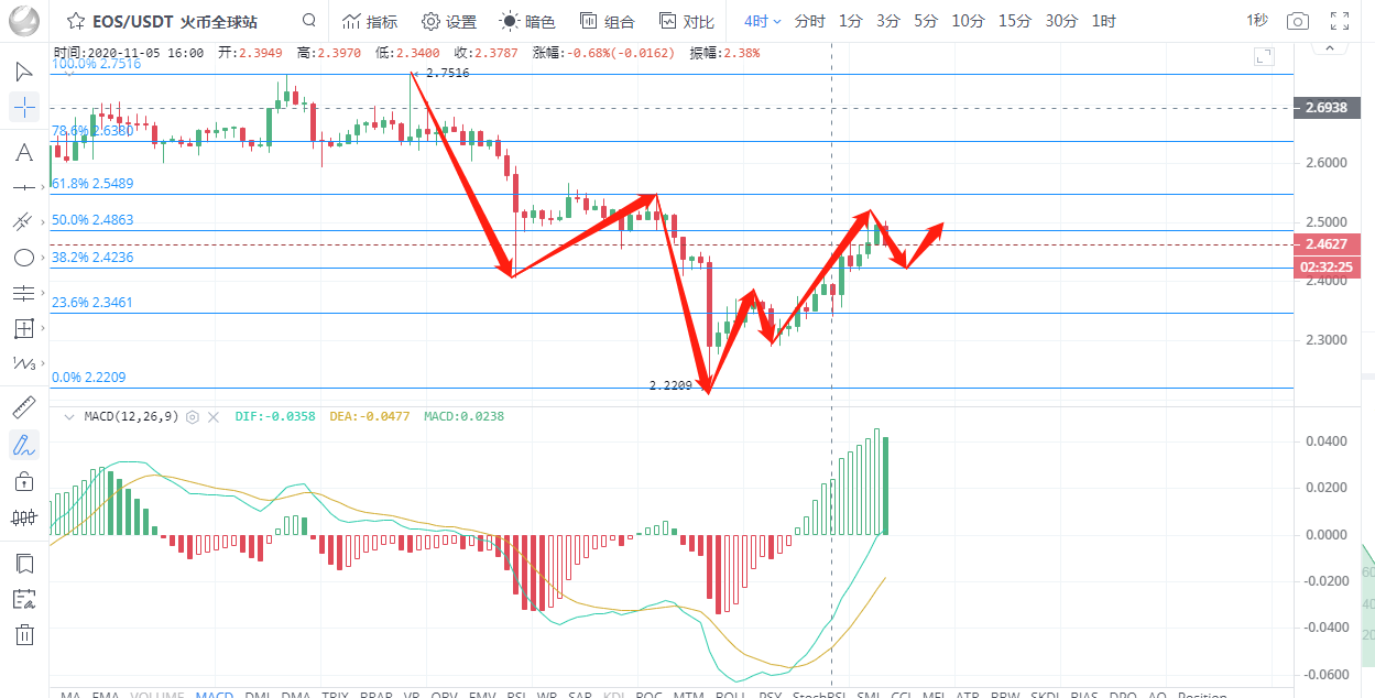 EOS行情分析:从四小时图看,布林带微微张口,K线运行在布林带上轨附近,行情自下跌至2.22一线后开始反弹,一路上涨至高点2.51一线后承压回落,附图中MACD双线金叉向上运行,绿色动能柱持续加强。上方压力位2.54,下方支撑位2.42.综合来看,多头逐渐发力,但上方抛压也比较严重,等待回踩获得支撑在入场。