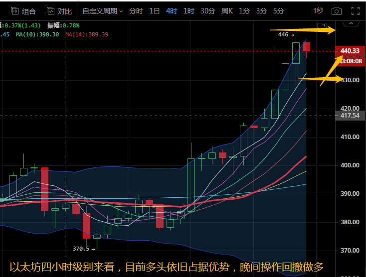 以太坊日内价格冲高到446后遭遇压制,开始回落下行,短期上方压力较强,有回调的迹象,四小时级别来看,附图中MACD快慢线勾头上行,多头动能柱持续放量,KDJ三线向前走平运行。四小时级别来看,行情多头上攻趋势明显,短期行情有小幅度回调趋势,下方关注430支撑,上方关注450整数关口能否突破并企稳,操作上汐柔建议回撤做多为主,顺势而为关注公众号:币汐柔。
