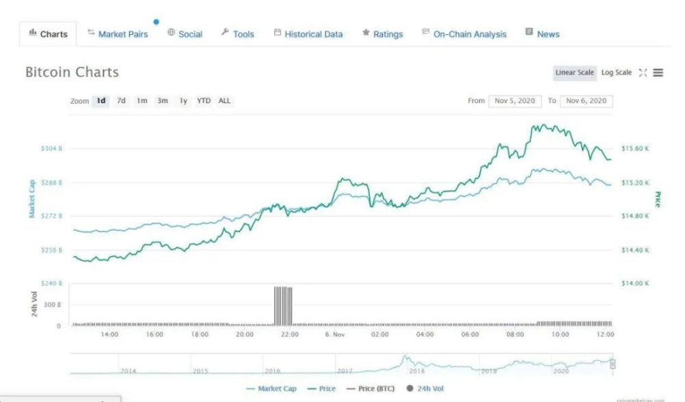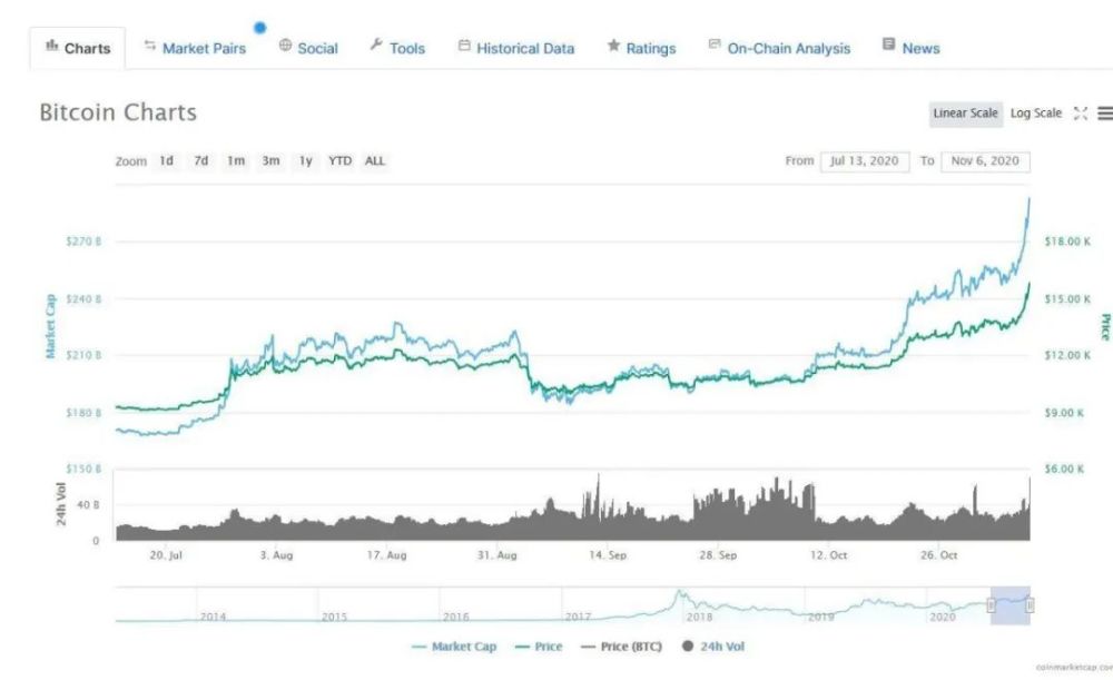 2020年11月6日晚,比特币价格不断攀升,一举突破15000美元大关,上一次出现15000美元以上的时点还是2018年1月。
