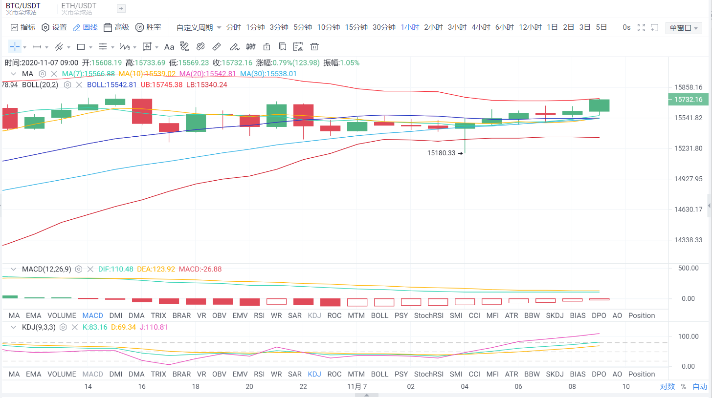 大家早上好,今日大饼我们从盘面来看,昨夜是一个平安夜没有特别大的波动,处于一个高位盘整状态,从一小时图来看,布林带开始缩口呈通道,币价运行在均线的上方,附图指标MACD快慢线零轴上方逐渐交金叉,空头能量柱开始缩量,KDJ向上高高上扬,目前多头力量还是较为强势的,大饼一拉就是几百的点,资金雄厚者中长线布局还是比较容易获益的,量小者下一篇文章我们看看以太。MG大选即将落幕,相信大家已经预知到了结果了,重点关注上方压力位15800附近,下方支撑15200附近,那么今日白间现在的我们只需要高抛低吸即可,静待消息面的冲击,抓住机会别墅靠大海。