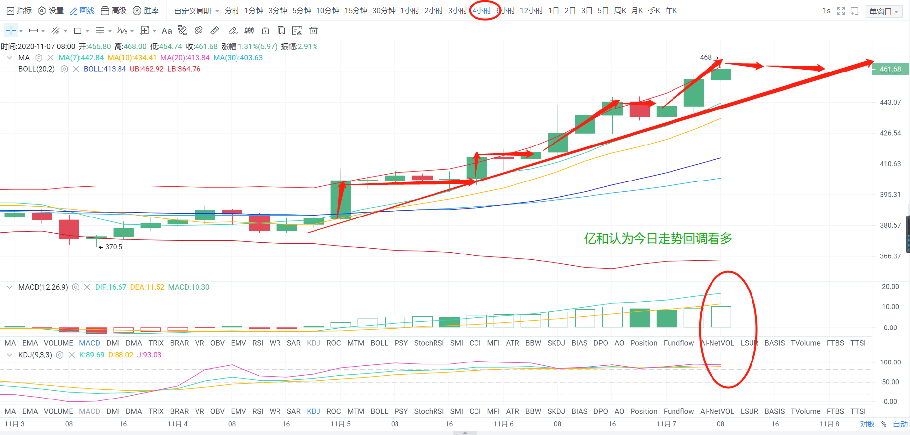 ETH昨日晚间价格到达446.20后遭到上方压力,夜间回调区间盘整,不辜负昨晚蓄势一夜,今日早间上探价位468位置。目前从四小时图来看已冲破布林带上方压力,币价目前运行在均线上方,附体指标macd快慢线零轴上方高高