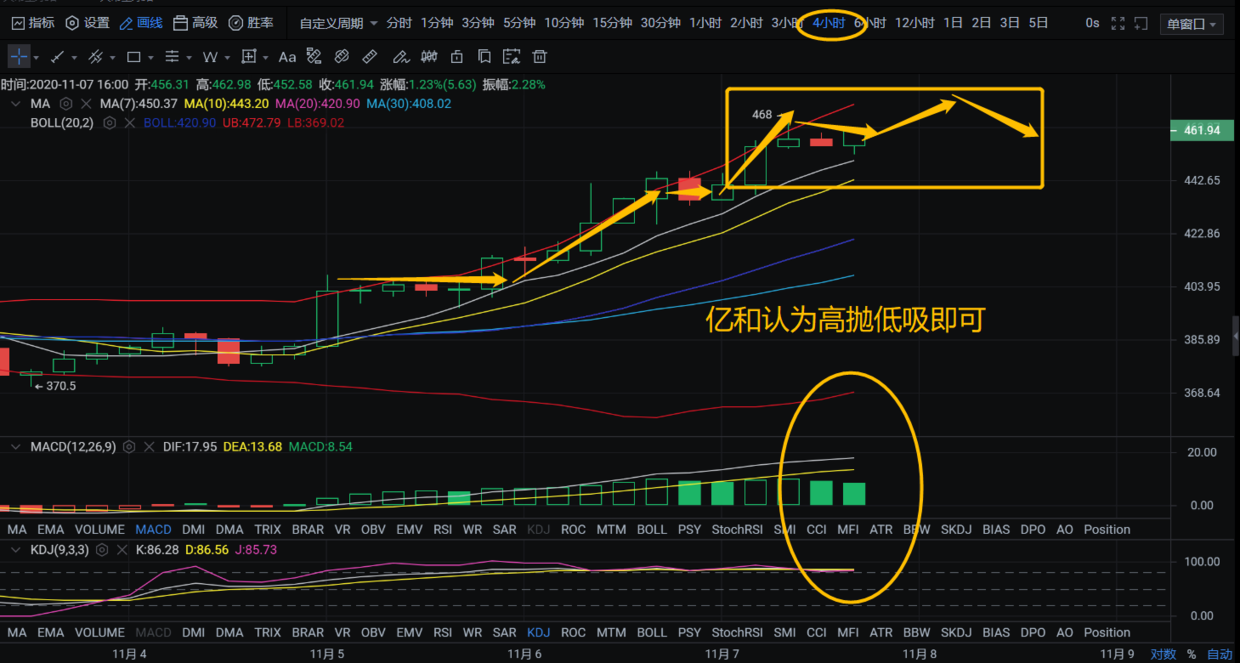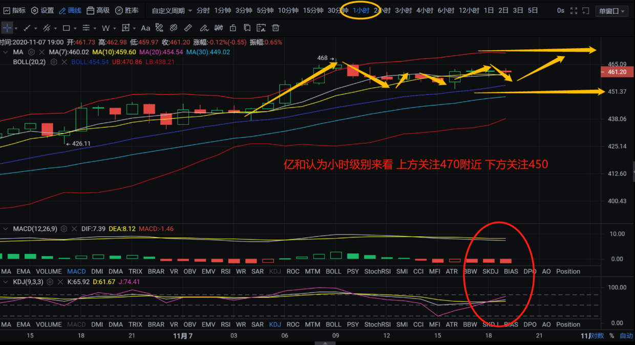 以太最近行情势头还不错,今日凌晨在441附近盘整4小时后多头持续放量,一波蓄力上探468点位,相信看过我文章的朋友,跟上操作已经满满当当,今日亿和也是预感处于区间震荡,目前币价在460附近徘徊,那么晚间我们该怎么操作呢?
