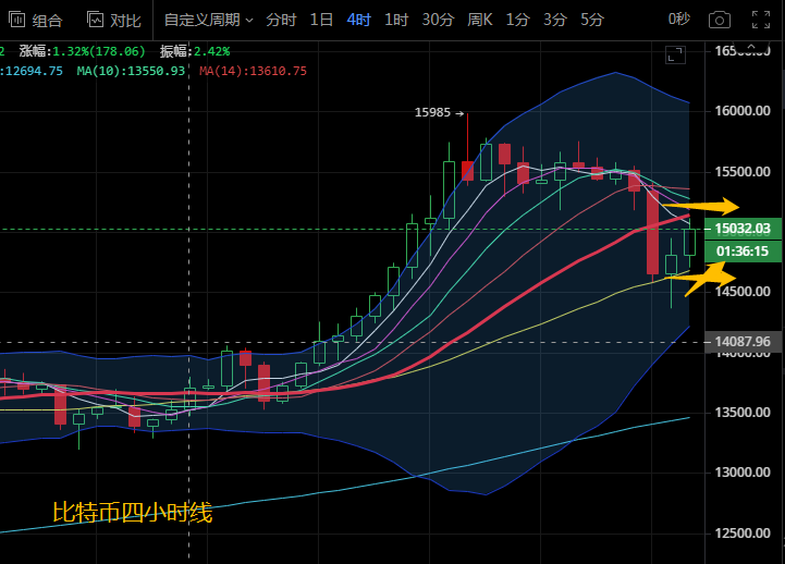 比特币四小时级别来看,布林带缩口向前运行,币价昨日行情一根大阴线跌破中轨支撑,行情运行在中下轨区域。MA5和MA10粘拐头向下运行。附图中MACD快慢线死叉向下运行在零轴上方,红色动能柱开始放量,盘面来看,四小时级别行情空头占优。四小时级别行情触底反弹,目前处在拉升趋势当中,日内操作高空低多即可,关注下方支撑14650,上方阻力15180,破位看15350。