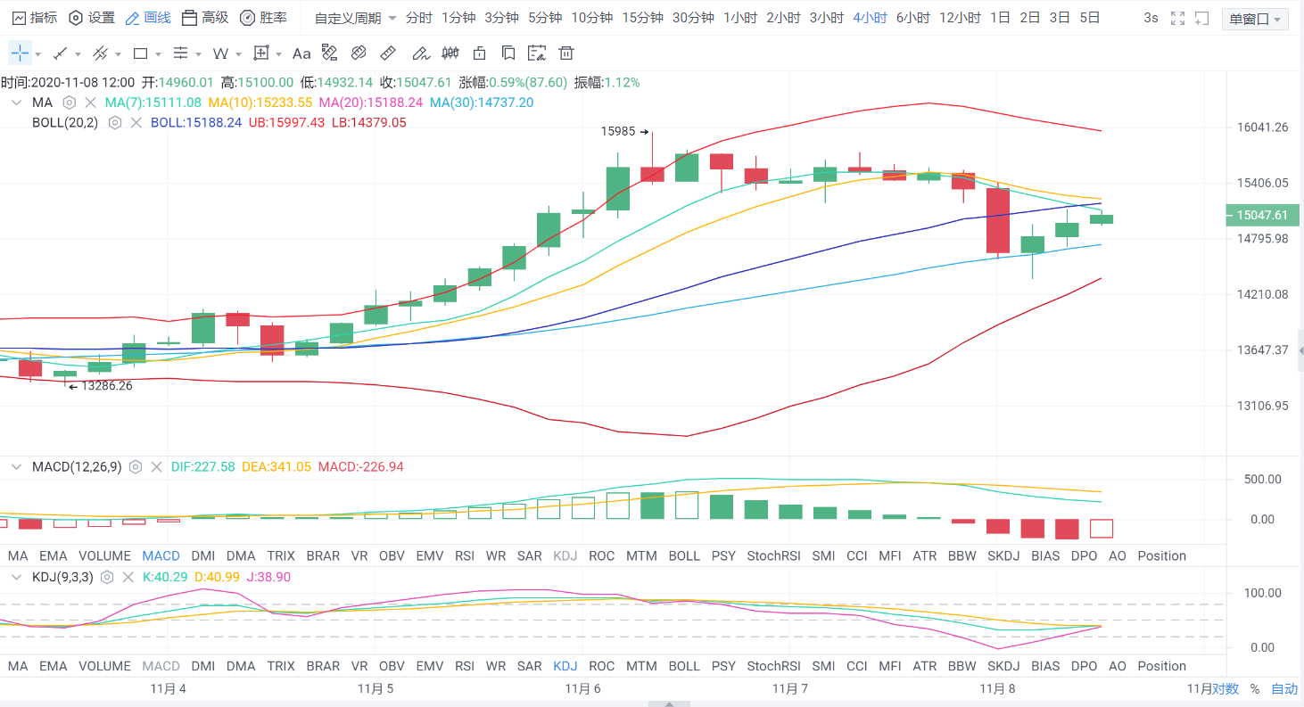 昨日比特币早间一波上涨,最高到达15753,随后承压回落,一路走震荡下行,持续到半夜,今日接近凌晨一波向下插针最低跌至15000附近,随后快速收回,但是空头远远没有结束,在今日凌晨早间4点还是跌破15000,最低到14366,相当于总体跌幅近千点。昨晚亿和也是深夜看盘直播,尽我所能地去帮助大家,目前技术指标分析再强也顶不住消息面对美股等一系列带来的影响,所以说有时候当断则断,不断则乱,抓住机会一波就会有所收获,做单时候一定要带好风控,切勿盲目进场。