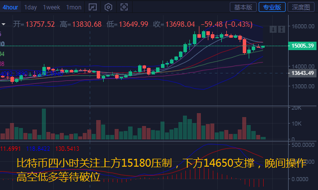 比特币四小时级别图来看,布林带缩口向前运行,币价运行在中下轨区域不断向上试探。各均线向下发散,附图中MACD快慢线向下拐头运行,红色动能放量,四小时级别来看,短期上方承压于中轨晚间关注能否突破。KDJ三线聚合向前运行。晚间操作汐柔建议关注上方15180的压制,下方14650附近支撑,操作建议高空低多等待破位。