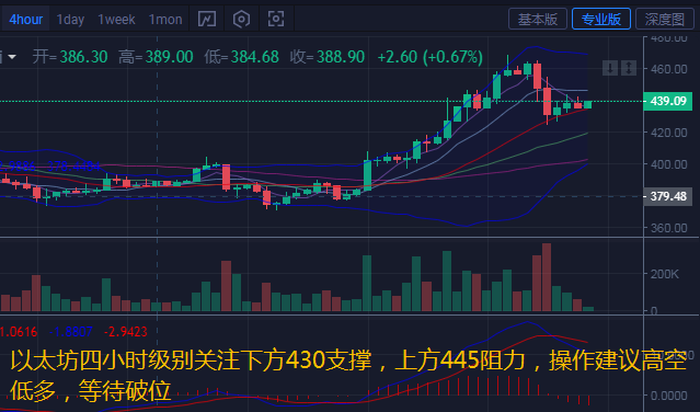 以太坊四小时级别来看,布林带收口向前运行,币价运行在中轨434第一支撑位上方。MA5与MA10死叉向下发散。附图中MACD快慢线位于零轴上方死叉向下,空头动能柱放量。KDJ有拐头迹象逐渐向前走平。四小时级别,晚间关注行情能否突破并企稳445一线支撑,再确定多头是否强势反转,下方关注430支撑。晚间操作上汐柔建议高空低多等待破位关注公众号:币汐柔。