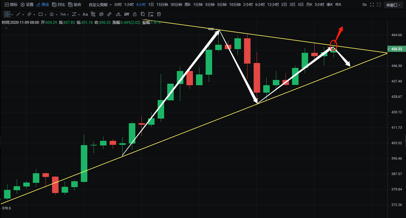 以太坊四小时级别来看价格跳水至424美金一线开始反弹。目前价格于三角收敛末端运行,行情任有补涨需求,后面继续关注前期高点位置。布林带呈张口运行,K线运行在中轨上方运行。价格运行在各均线上方。幅图指标MACD于0轴上方死叉运行,KDJ指标三线向上发散运行,RSI指标三线粘合运行。上方压力位460-468,下方支撑位445。操作上高空低多为主。