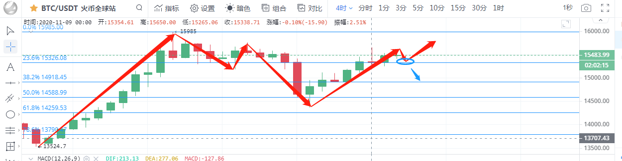 从四小时图看,布林带缩口运行,K线运行在布林带中上轨,5日均线上穿10日均线金叉在下方形成短暂支撑,从盘面上看,行情呈现震荡上行的趋势,目前行情承压回调,只要行情回调不破中轨15350一线支撑,依旧看涨不变。