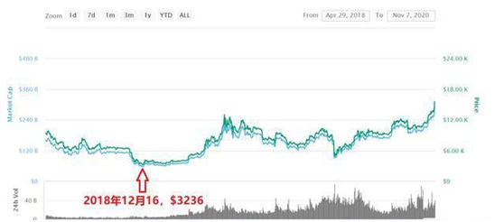 而上一轮牛市之前,比特币的最低值是2016年1月18日的199美元。