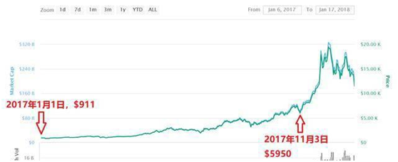 第二个阶段是从2017年1月1日开始到2017年11月3日,经过10个月的巩固走高,比特币从911美元涨到了5950美元,币价涨了6.5倍;