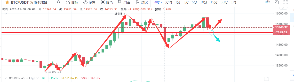 比特币行情分析:比特币行情自下午下跌至15141一线后开始反弹上行,最高冲击15850一线后开始承压回落,直接向下插针一波来至15200一线后开始反弹,目前运行在15500一线附近。从四小时图看,上个周期一根大阳线直破布林带中轨向上冲击布林带上轨,而这个周期向下插针获得30日均线支撑后迅速反弹,所幸这波跳水并未跌破15100一线,个人认为这波实属诱空行为,行情的多头趋势并未被破坏。布林带缩口运行,5日均线上穿10日均线运行,附图MACD双线死叉向下运行,红色动能柱弱势放量。KDJ三线粘合有死叉之势。指标上偏向空头,但若行情不破下方15100一线支撑,行情还是会向上试探的。