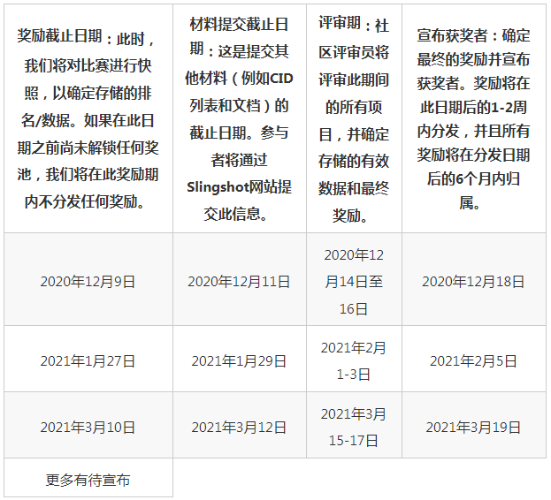 存储奖励每月分配一次,其中存储层已解锁。我们的计划是在接下来的几个月中继续进行这项比赛。我们认为,如果我们能够每月提供奖励,而不必等到比赛结束就更好了!结果,我们有了每月的奖励窗口,将用于确定该月的最终奖励分配。以下所有截止日期均为1800 UTC