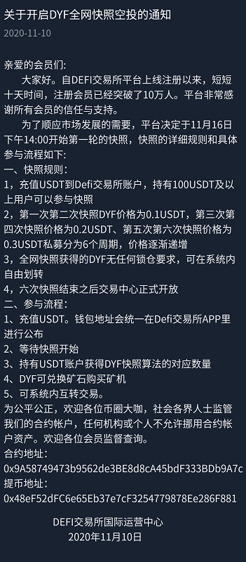 发行的空气币DYF也只能在盘内交易,与defi有关的智能合约和defi借贷功能都没有。这个就是去中心化金融“defi”项目?