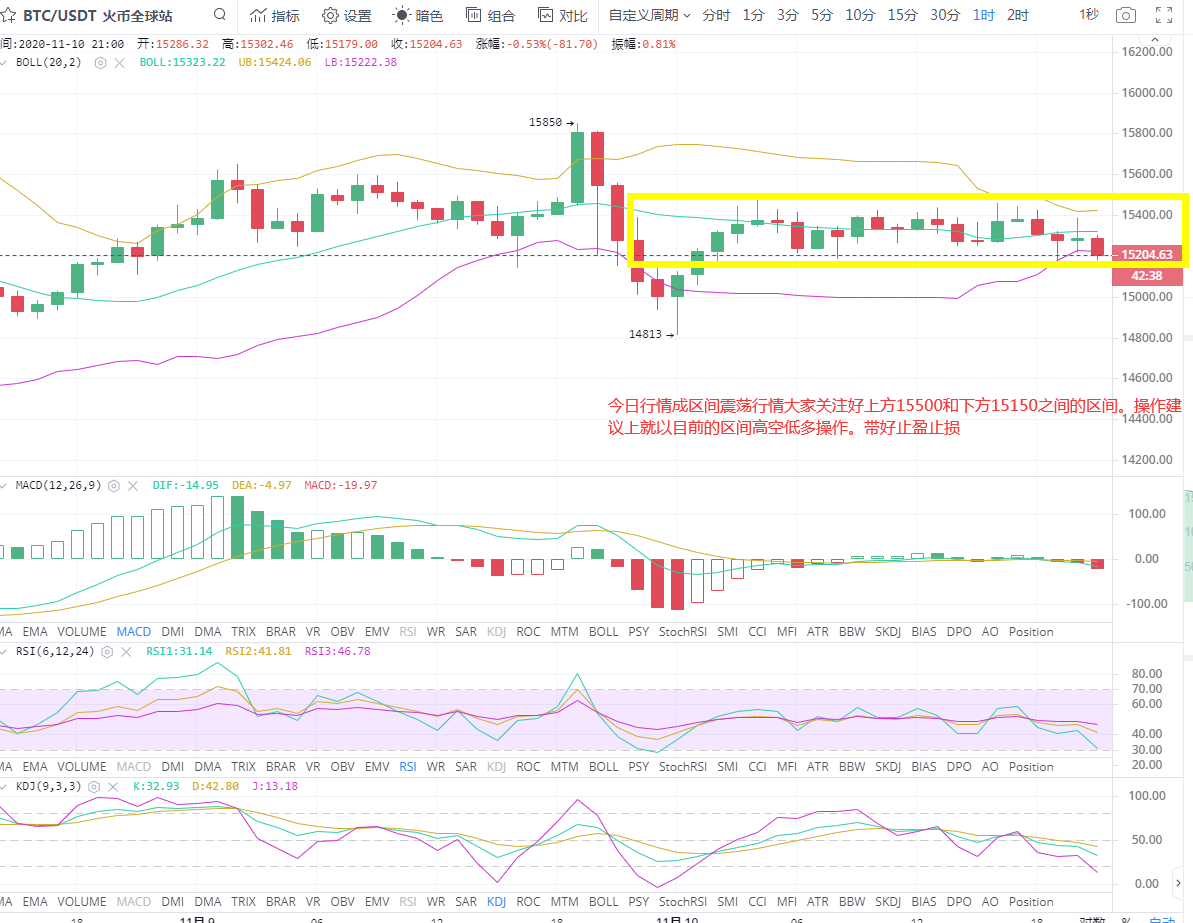 大饼在昨日行情突然来了暴涨暴跌导致目前的多头情绪低迷,市场上的成交量明显减弱,今日来看行情并没有太大的波动,一直处于一个区间的震荡行情。虽热处于震荡,但空头趋势明显减弱,现在又从新回到了15000大关上,从四小时线上看目前价格处在中轨的位置,下方有中轨支撑,行情短暂呈现下不去起不来的局面。MACD成死叉向下运行红色动能柱放量从小线上看布林带成缩口状态KDJ三线成向下散发下方的支撑位置可关注15150点,上方的阻力位看到15500点位。目前市场行情的成交量成疲软的状态。短时间上看目前仍处于震荡的行情综合分析上晚间的操作思路高空低多做好区间震荡的准备。