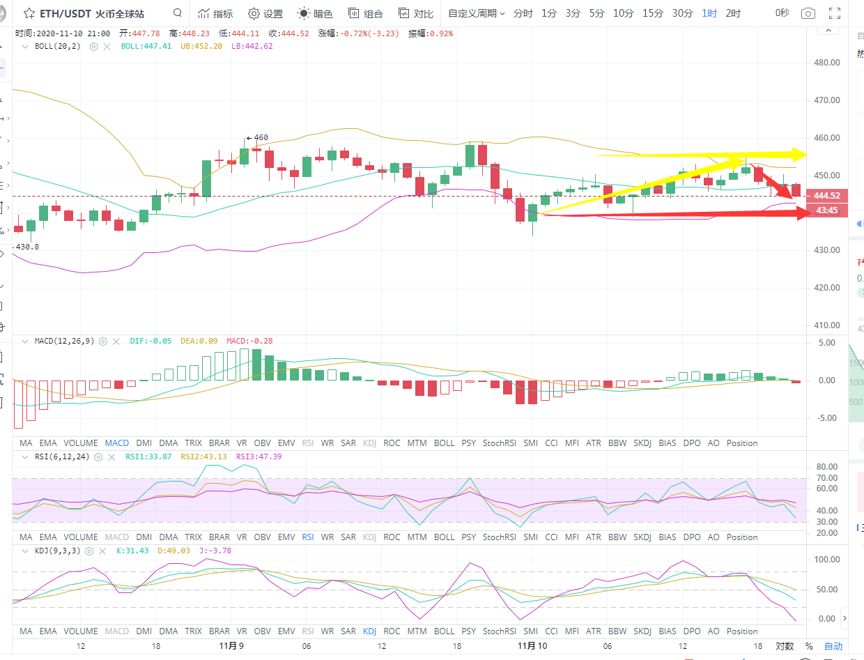 以太坊随大饼的波动在昨日也出现上涨下跌的行情,市场上犹豫主流货币的上涨下跌导致许多散户不敢贸然的进军市场,成交量对比前几日明显有下降的趋势,导致今日的行情走势一直处于一个区间震荡的行情,短期上目前多空对弈市场走向不明显。投资者不敢盲目下手,从四小时线上去看目前币价运行在布林带中轨,上方阻力强劲多头上涨力度不大一直没有稳住450的位置上,从小时线上看盘面整个布林带成缩口状态MACD成粘合状态RSI成超卖KDJ开始有向下散发的迹象。以太坊在昨日下跌明显不比大饼的上涨趋势,目前看来空军仍处于优势,行情走势偏向于区间的震荡,上方大家可以关注455下方关注440的一个区间操作建议高空为主,低多为辅.