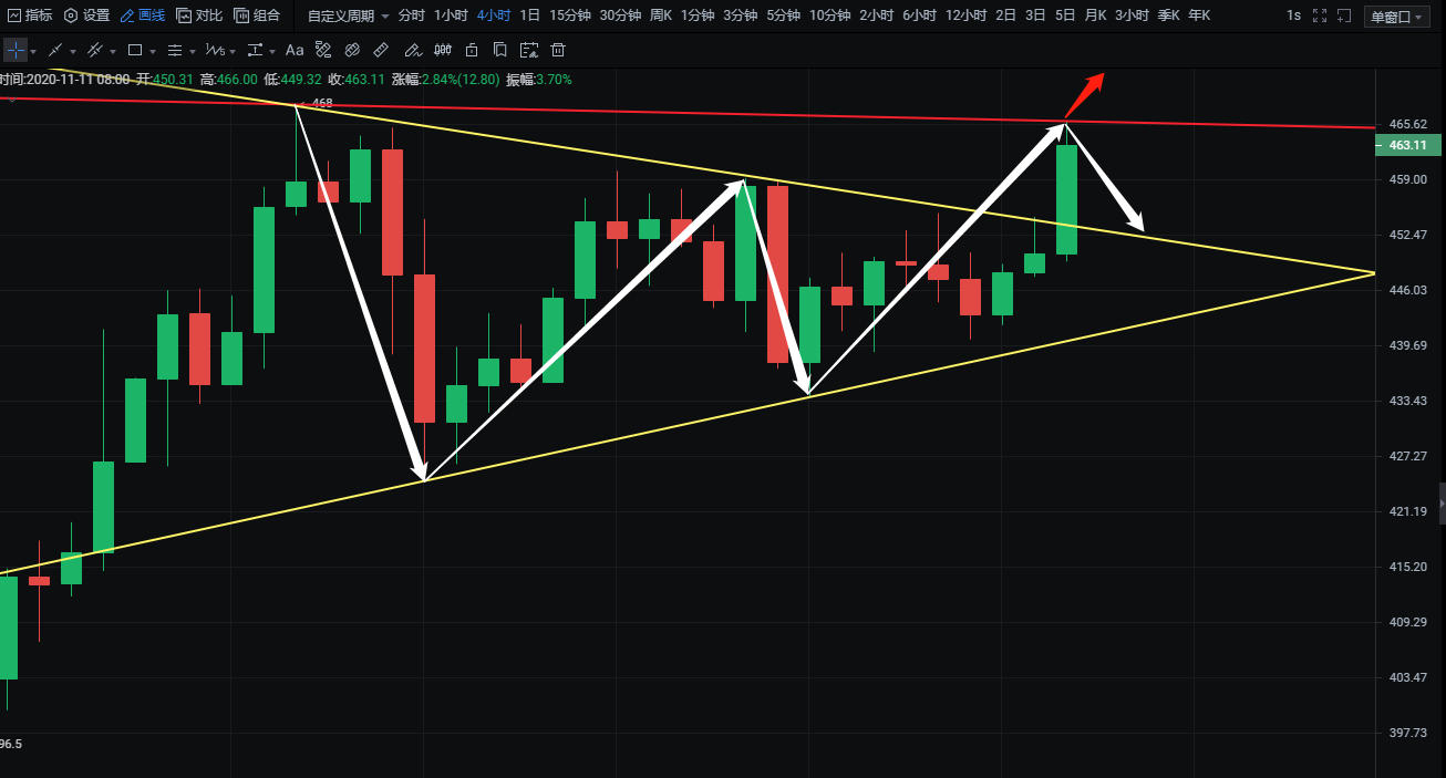 以太坊四小时级别来看价格早间联动比特币拉升上行突破三角上轨趋势线压制。目前价格于前高附近受阻,多头强势,后面继续关注前期高点位置。布林带呈缩口运行,K线运行在上轨附近运行。价格运行在各均线上方。幅图指标MACD于0轴上方有金叉迹象,KDJ指标三线向上发散运行,RSI指标三线向上拐头运行。上方压力位470-468,下方支撑位453。操作上高空低多为主。