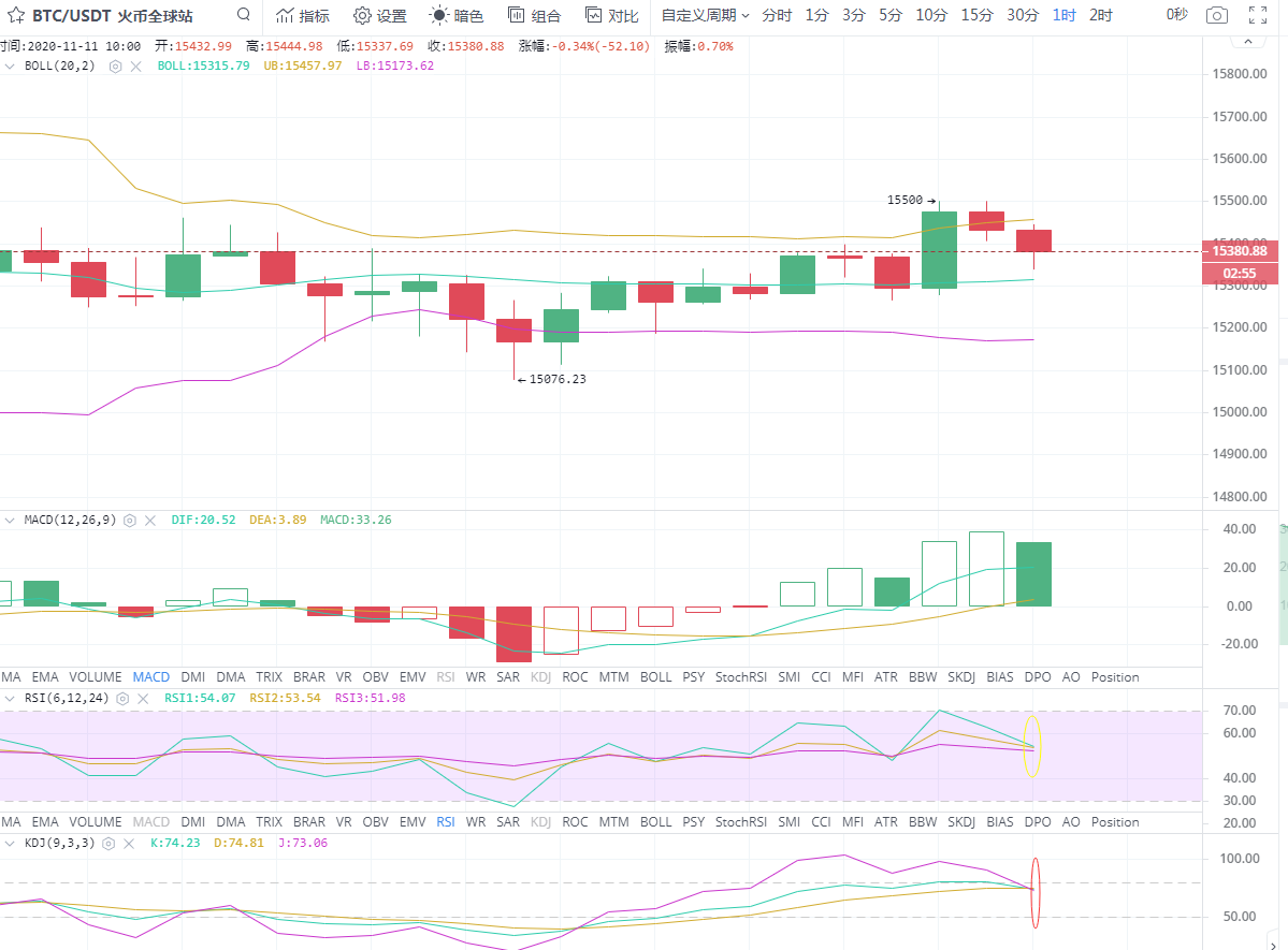 从四小时线上看比特币并没有从昨日的震荡的行情走出来,昨日晚间上行情一直处于区间震荡。今日早间行情才有所上涨但是并未突破到15500点目前币价暂时还算比较稳定,布林带成缩口状态币价运行在上轨,MACD平行向下。今日行情暂时还是处于震荡区间,小时线上看比特币涨到15500点就开始下跌MACD成三线平行运行,综合分析上看今日比特币并未走出震荡行情,操作建议上雅晴建议高空低多。延续昨晚的策略上方阻力看15500点下方支撑看向15150.