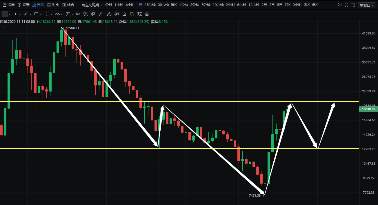 YFI前面说的三浪下跌后会有一波不错的反弹,价格下跌触及7451美金反弹至目前最高点19350美金,反弹力度11898点。后期关注走势能否演变成头肩底形态,上方压力位20000,下方支撑位122260。操作上低吸为主。