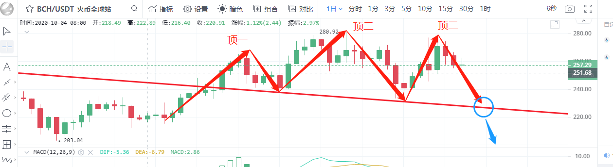 BCH:从日线上看,布林带张口运行,K线运行在布林带中轨下方,上方5日均线交汇于布林带中轨压制币价承压下行风险。附图中MACD双线死叉在零轴上方运行,红色动能柱持续放量,KDJ三线即将死叉运行,从指标上看,行情还有下跌的可能,若行情后续持续下跌,形成三重顶形态,那么行情将不容乐观,现货的朋友要及时抛掉了,合约方面可以考虑空单入场。短期上方压力位262,短期下方支撑位240。