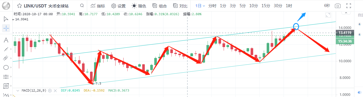 LINK:从日线上看,布林带张口向上,5日均线上穿10日均线金叉运行,附图MACD双线金叉向上运行,绿色动能柱持续放量,KDJ三线金叉向上发散,综合盘面上看,币价运行在上行通道之内,行情走势较为健康,多头趋势还是较为明显,关注上方压力位14,下方支撑位10。若币价突破14美金可考虑买入,反之还是有下行风险的。