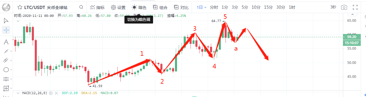 LTC:从日线上看,行情已经走完第5浪,已经来到a点,后续行情大概率将上行回到3浪60.61美金与5浪64.77美金的区间内然后下跌走完整个波浪形态,那么在60.61美金-64.77美金区间内可以考虑抛掉,待到走完整个波浪形态后在考虑买入。