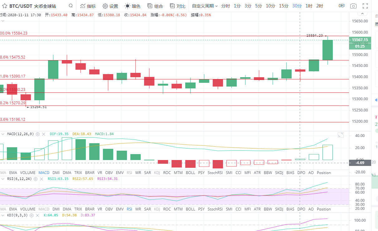 从四小时线看比特币今日行情上比特币一直处于一个震荡盘整的行情,上方15500点的阻力位置一直都未打破。目前布林带成缩口状态一直,正所谓横久必跌。今天多头多次试探阻力位无果MACD成死叉红色动能柱放量。上方阻力位置看向15500下方看向15000的位置。从小时线上看币价在中轨上方MA5均线交叉在10均线上方成金叉绿色动能柱RSI成超买迹象晚间综合分析高空低多,破位可以顺势操作带好止盈止损。