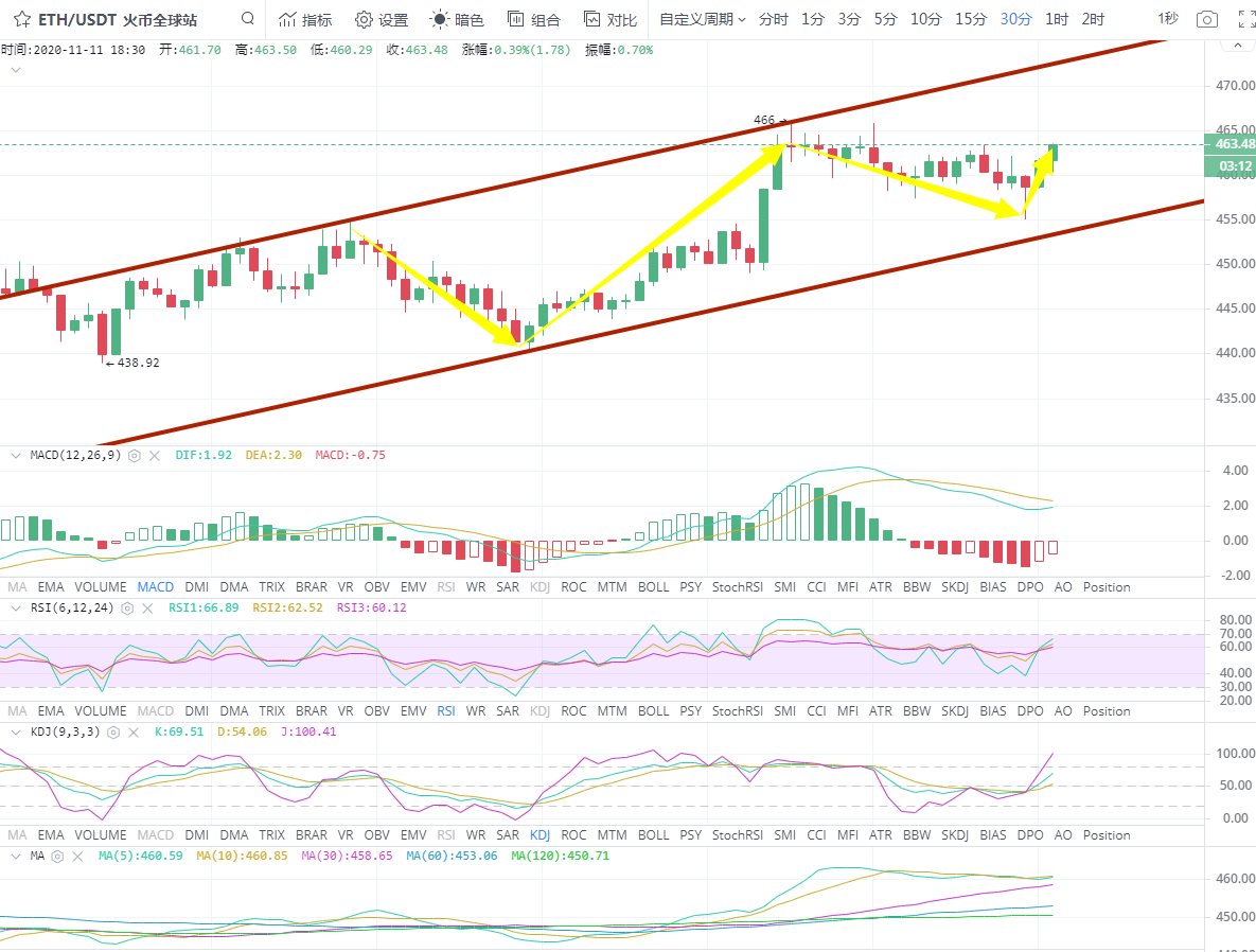 从四小线上看以太坊今日独立特行成上涨趋势带动了其他的币种的上涨,目前四小线上看一直处于震荡上行目前已经到460的位置,MACD成粘合状态从小时线上看布林带开口比价运行在中轨上方MACD成金叉运行KDJ平行运行。从技术指标上看多头并未出现占优的现象短期大家还是看好上方阻力看好470下方的支撑位置看好455.晚间若是站稳460的位置以太预计还会向上试探470一线。操作建议上以回踩多单为主。高空为辅