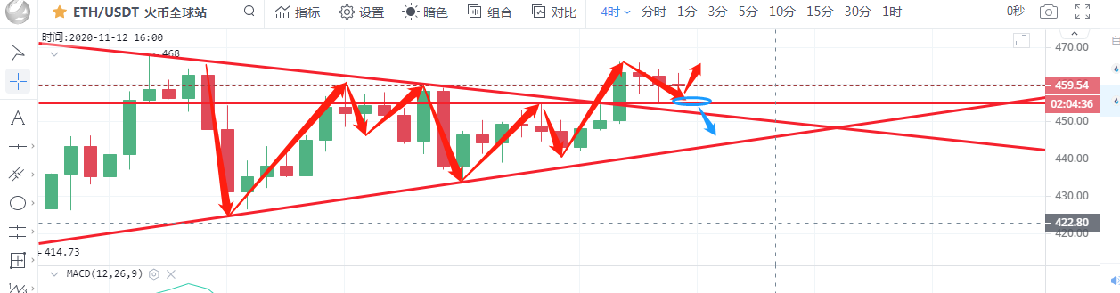 以太坊行情分析:以太坊早间直线拉升至466一线后承压回落,目前运行459一线附近。从四小时图看,以太坊多头率先突破三角区间,但上行受阻,行情承压回落,午夜还是关注455一线支撑,若下破,行情将重回三角区间内,多单的话还是等行情企稳460一线后在多单买入。