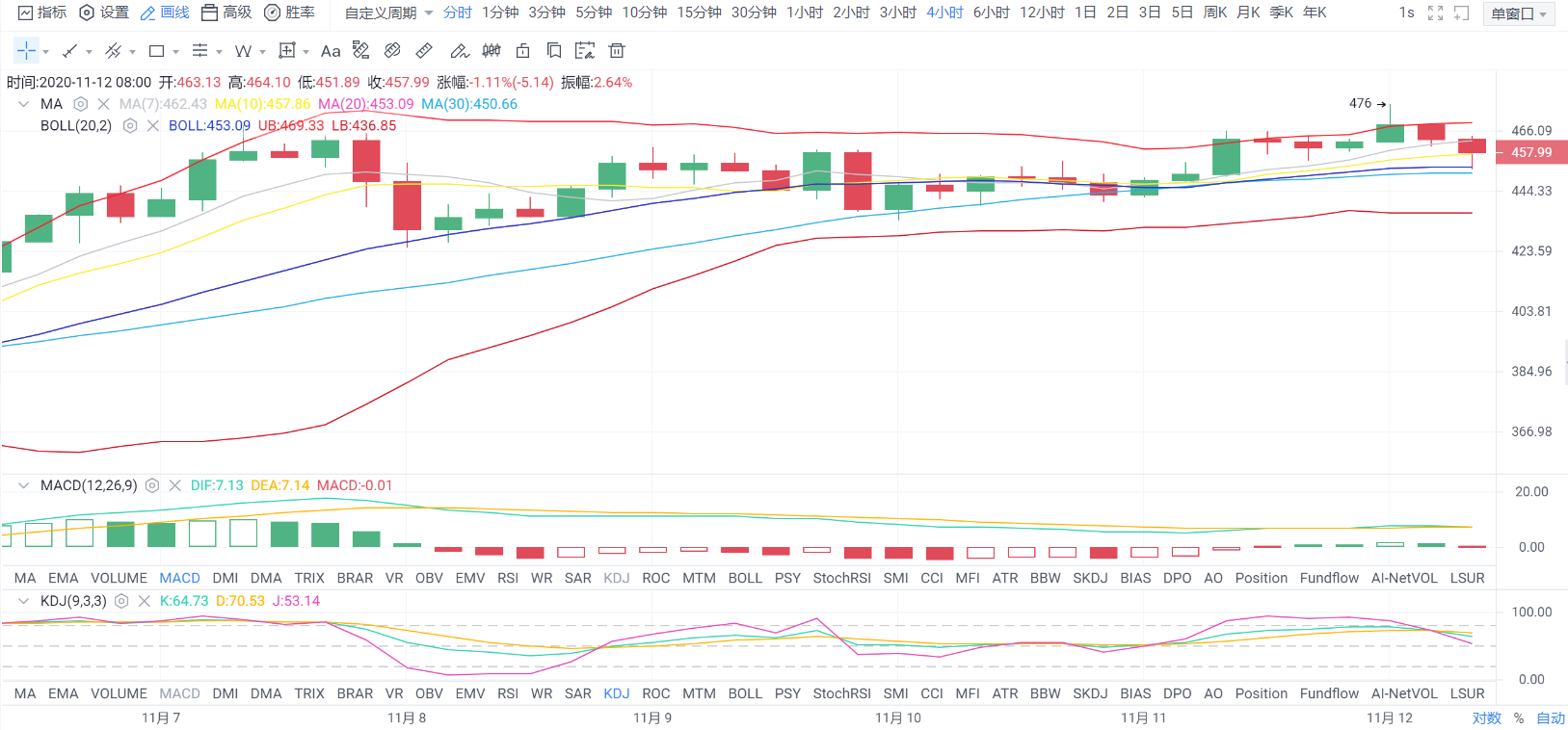以太坊四小时级别来看,布林带平缓向前运行,币价拉升运行在布林带上轨上方,各均线微微向上拐头。附图中MACD快慢线有金叉趋势运行在零轴上方,红色动能柱缩量,KDJ三线向下发散。四小时级别来看,空头情绪减弱,多头开始回暖,日内操作建议关注下方支撑450-455上 方压465-470, 操作建议高空低多即可。