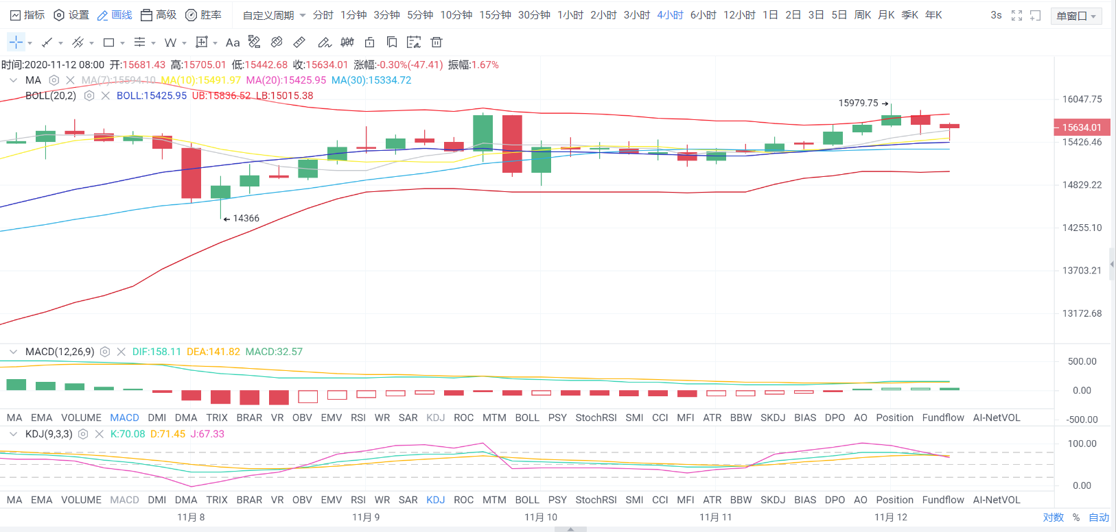 比特币行情昨日震荡为主,行情下行触及15076.23后拉升反弹,今日早间行情多头反攻拉升,一根大阳柱刺破上轨打开上方空间,目前币价稳定在15630附近运行。比特币四小时线级别来看,行情一直稳定在中轨附近,早间多头发力上攻,稳定在中上轨区域。四小时级别各均线粘合运行在中轨上方,附图中MACD快慢线向上拐头运行,绿色动能柱放量,KDJ三线向下交叉运行。四小时级别来看,多头动能持续放量, 行情有上行趋势,日内操作建议关注区间15350- 15750,操作建议高空低多。